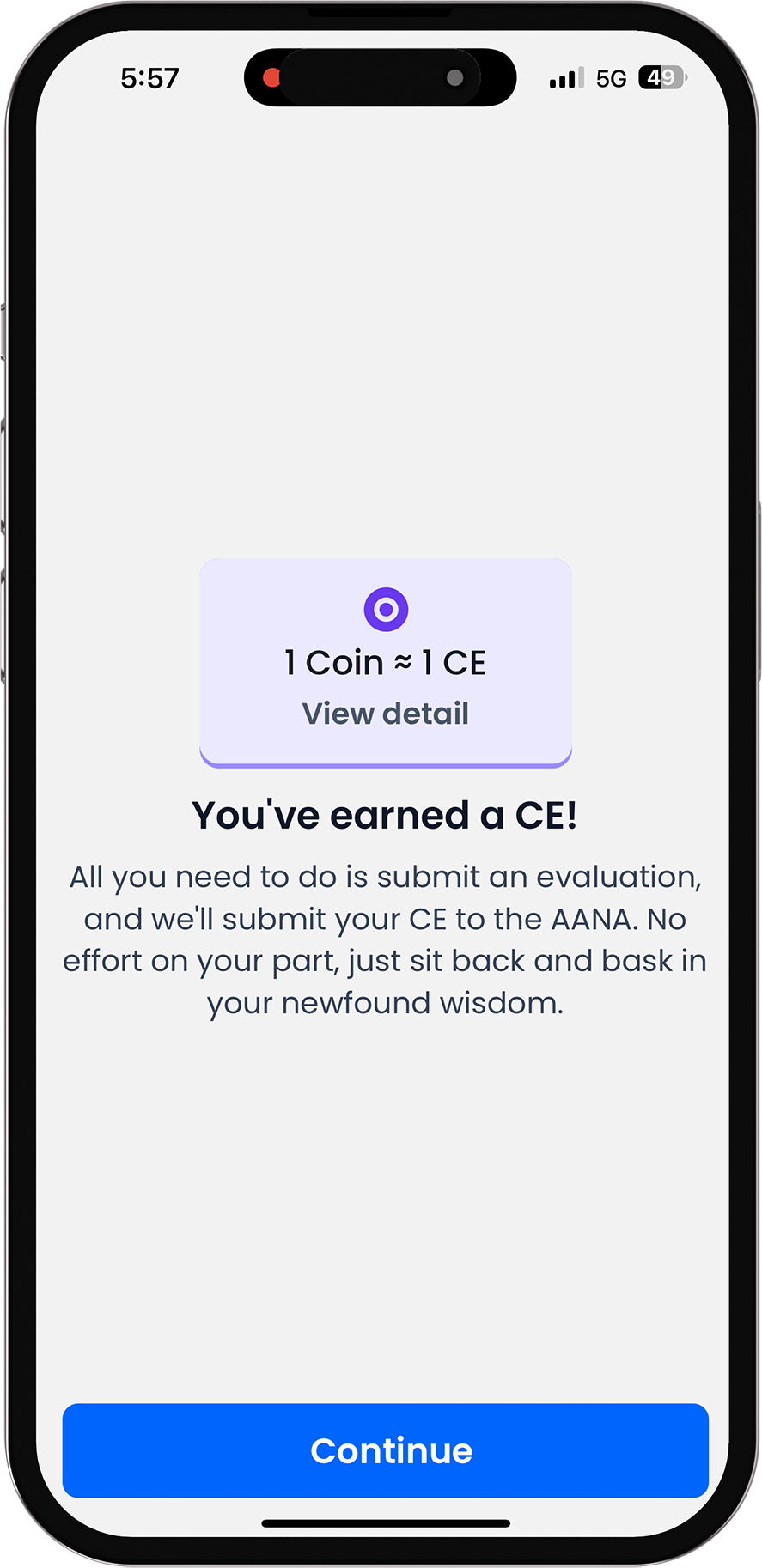 Learn and review content in the app at no cost. When you’re ready to earn CE, purchase and redeem a credit, complete a brief evaluation, and your completion is submitted directly to AANA.